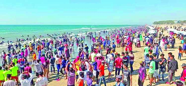 শীতের আগমনী আবহাওয়ায় সাগর অনেকটায় শান্ত। তাই সাপ্তাহিক ছুটির দিনে ক্লান্তি ভুলে সাগরের বিশাল বালুচরের মাঝে আনন্দে মেতেছেন পর্যটকরা। সমুদ্রের নোনাজল আর আকাশের বিশালতার মাঝে খুঁজে নিচ্ছেন প্রশান্তি।