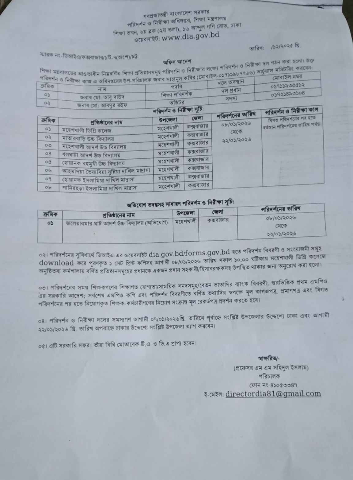 মহেশখালী শিক্ষাঙ্গনে শৃঙ্খলা ফেরাতে এবং আর্থিক অনিয়ম ও জাল সনদের অভিযোগ খতিয়ে দেখতে কক্সবাজারের মহেশখালীতে বড় ধরনের অভিযানে নামছে শিক্ষা মন্ত্রণালয়ের পরিদর্শন ও নিরীক্ষা অধিদপ্তর (ডিআইএ)। আগামী ৮ জানুয়ারি ২০২৬ থেকে ২২ জানুয়ারি ২০২৬ পর্যন্ত উপজেলার বিভিন্ন স্কুল, কলেজ ও মাদ্রাসায় এই বিশেষ পরিদর্শন ও নিরীক্ষা কার্যক্রম চলবে।