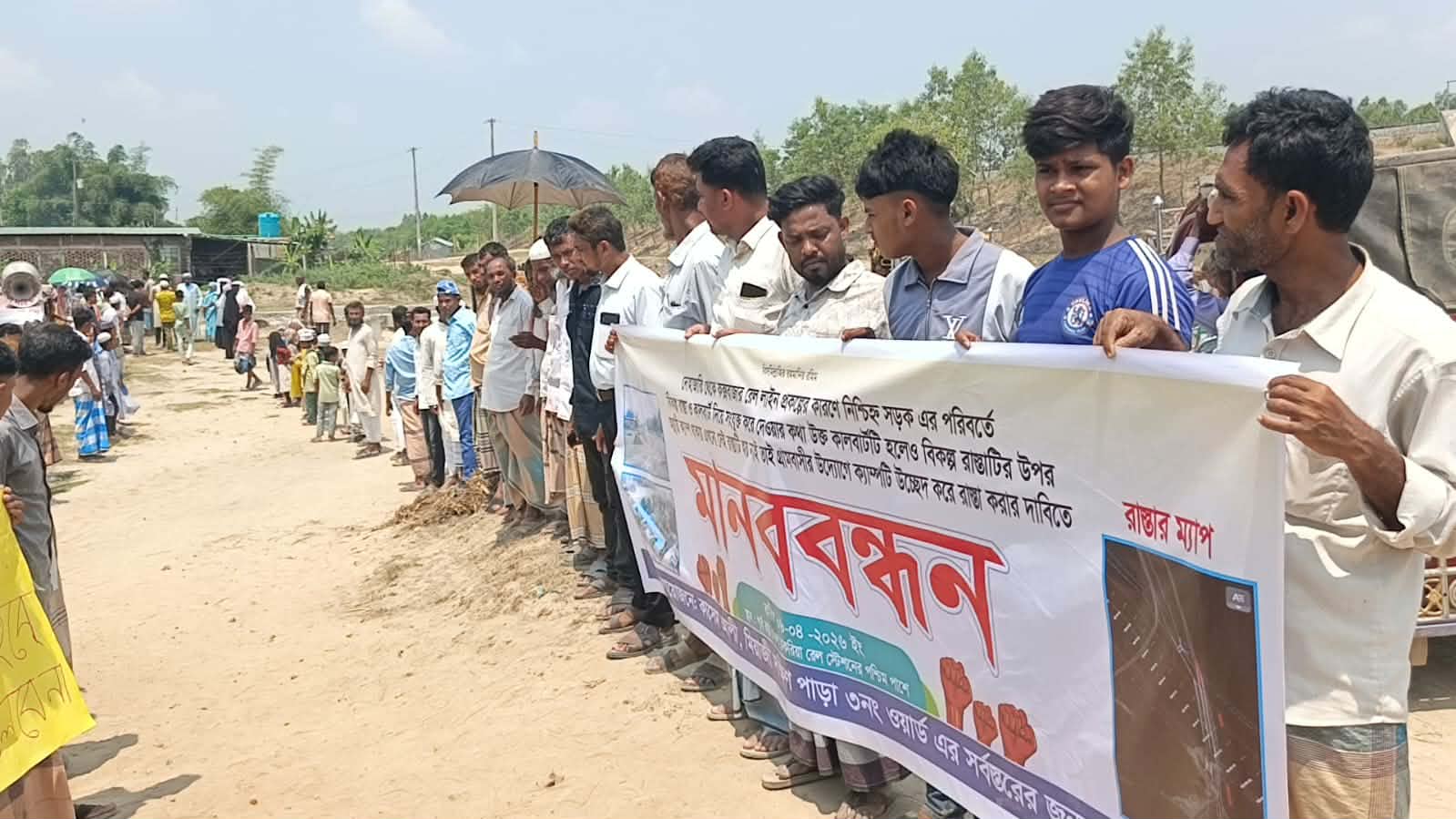মানববন্ধনে কলেজ ছাত্র দিদারুল ইসলাম জানান, এই রাস্তা দিয়ে শতশত মানুষ, স্কুল ছাত্র ছাত্রী চলাচল করেন,বর্ষাকালে কোমর পর্যন্ত পানি জমে থাকে এই রাস্তায়। রেললাইন নির্মাণ কাজ করার জন্য এই রাস্তার উপর অস্থায়ী ক্যাম্প নির্মাণ করেন ঠিকাদার তমা কোম্পানি। কাজ শেষ হলে ক্যাম্পটি ভেঙে ফেলার শর্তে ইজারা দেন এলাকার কয়েকজন ব্যক্তিকে রেল কতৃপক্ষ। অদ্যবধী ক্যাম্পটি না ভাঙ্গায় বিকল্প সড়কটি নির্মাণ করা যাচ্ছে না। দখলবাজদের উচ্ছেদ করে বিকল্প সড়কটি নির্মাণে স্বরাষ্ট্র মন্ত্রী, উপজেলা নির্বাহী কর্মকর্তা ও রেলওয়ে সহ সংশ্লিষ্ট কতৃপক্ষের সুদৃষ্টি কামনা করেন তিনি।